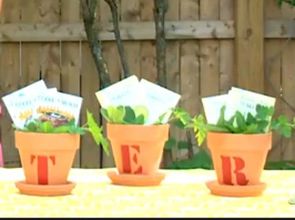 Các bước thực hiện rất đơn giản, đầu tiên bạn hãy vẽ chữ cái đầu tiên của bé lên tờ giấy A4, sau đó cắt bỏ phần trong của chữ để tạo khoảng rỗng. Áp tờ giấy đã được cắt theo viền chữ lên chậu hoa, dùng sơn và cọ để tô phần rỗng của tờ giấy. Như vậy là bạn đã hoàn thành xong phần trang trí chữ. Tiếp đến hãy dùng những bức hình thật đẹp của bé hay cả gia đình đặt vào chậu hoa, tô điểm thêm những chiếc lá hay hoa để tạo thêm phần đặc sắc.