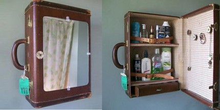 Đóng vài chiếc móc, kệ treo đồ vào trong chiếc va li cũ và treo chúng lên tường, bạn đã có tủ để thuốc, dầu gội, sữa tắm có một không hai. Đừng quên gắn thêm gương lên phía bên ngoài chiếc va li để tận dụng thêm công năng của chiếc va li cũ.
